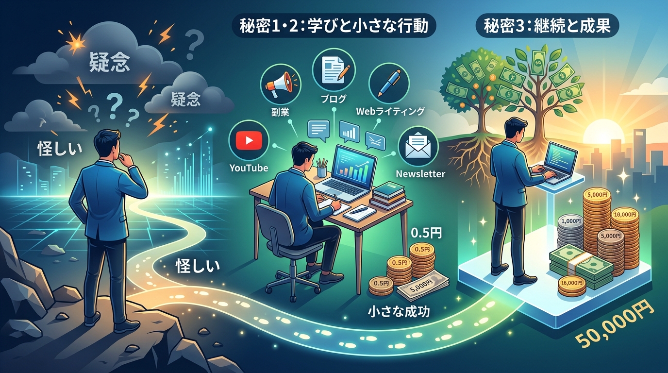 私が「お金の大学」の無料コンテンツを活用し、月5万円を稼げた秘密は、以下の3点に集約されます。
